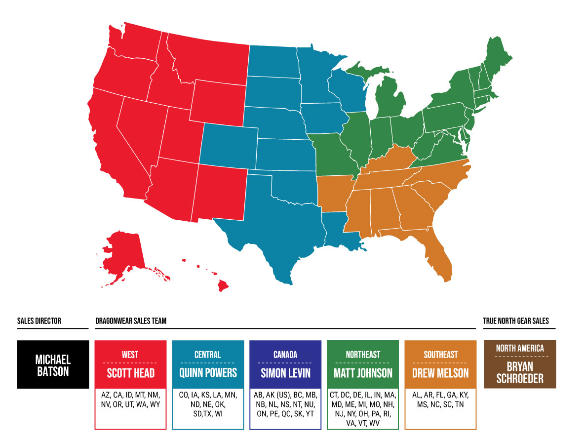 Unsure who to contact? Refer to our DragonWear sales territory map to see which of our sales team members can assist with your state.
